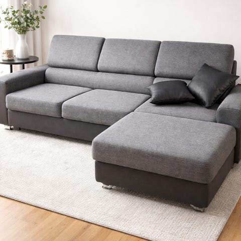 3-sits soffa med tygklädsel. Soffan görs enkelt om till en säng. Sittdynor med pocketfjädrar och skumstoppning. Ryggdynor i skum. Med förvaring. Kan spegelvändas. Sovyta 149x195 cm. B244 x H86 x D89/163 cm