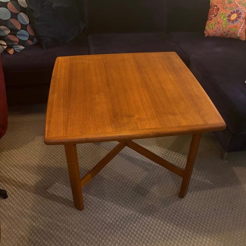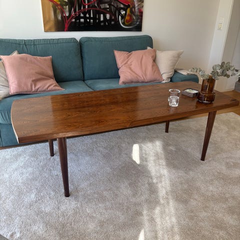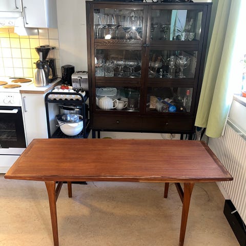 Säljer ett stilrent soffbord i teak med klassisk retrodesign från 50–60-tal.
