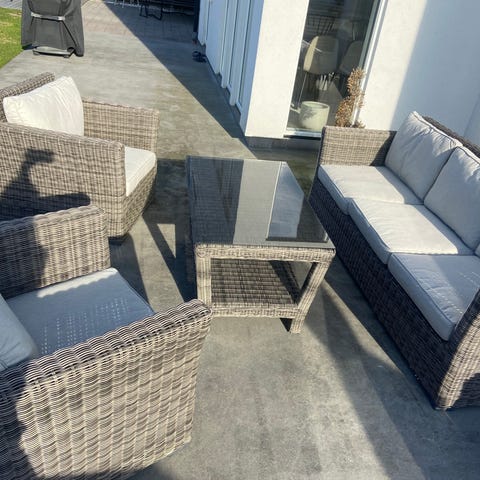 2 fåtöljer med bord som alltid har stått under tak frå Hillerstorp möbler