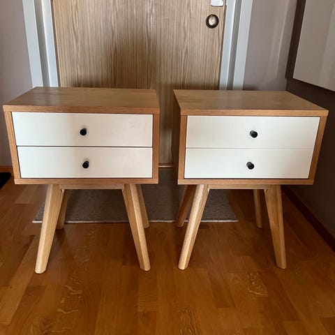 Säljer två sängbord från Jysk som vi haft i knappt ett år. Det är några små fläckar på ovansidan (se bild), detta på grund av att de är obehandlade. Går bra att olja eller måla sängborden.