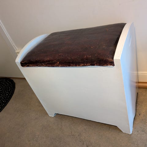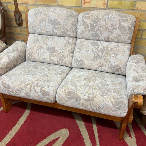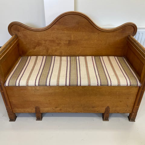 Utdragbar träsoffa med förvaring och sits i brunt läderliknande material med dekorativa nitar. Soffan har ryggstöd med svarvade spjälor och ben i trä. Förvaringsutrymme finns under sitsen, lämpligt för exempelvis kuddar, filtar eller annan förvaring i hall, kök eller vardagsrum.