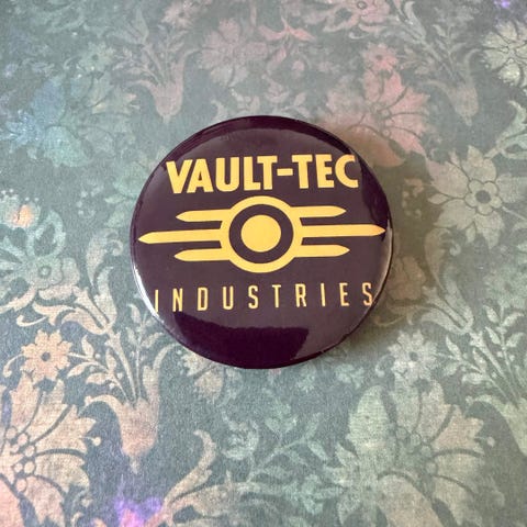 Vault-Tec Fallout pin med kvadratisk form. Motivet visar Vault-Tec-logotypen i blått på mörk bakgrund. Nålen har metallbaksida med nålfäste. Passar för att fästa på till exempel jacka, väska eller keps.