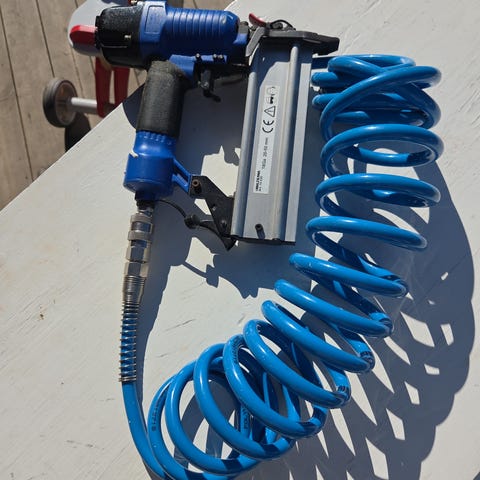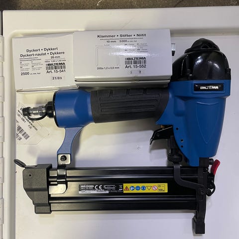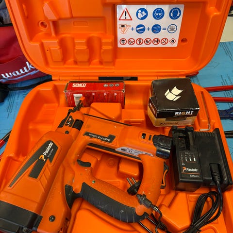 Jula spikpistol i plastväska. Med olika tillbehör/spik. Fungerar som ska