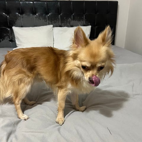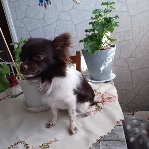 Hon ser mest chihuahua ut, pälsen är som en chihuahua trots att det är lite mer pudel i henne än chihuahua. 62,5% toypudel och 37,5% chihuahua.