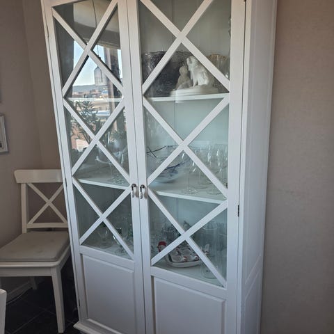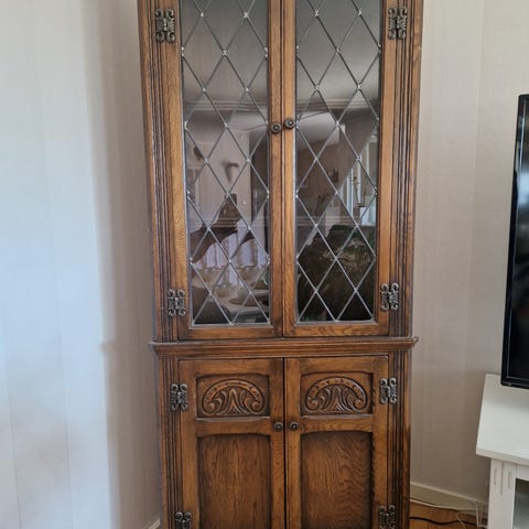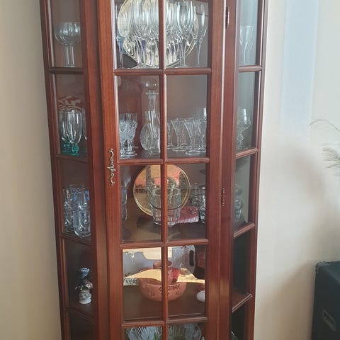 Vitrinskåp och sideboard i trä med mahogny finish. Sideboardet har två glasdörrar med förvaring som lämpar sig för glas, porslin eller böcker, samt flera lådor med beslag i metall. Vitrinskåpet har glasdörr upptill och trädörr nertill, båda med nyckelhål. Möbeln passar för förvaring i vardagsrum, matsal eller kök och ger möjlighet att både visa upp och dölja innehåll. Materialet är trä med inslag av fasettslipat glas i dörrarna och beslag i metall.