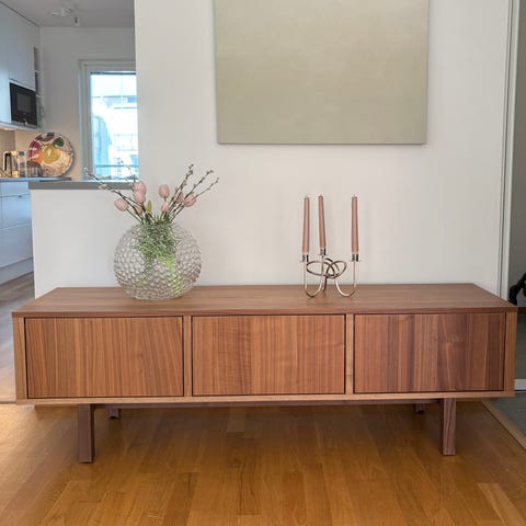 IKEA Stockholm sideboard/skänk/sidobord i valnötsfaner i fint begagnat skick. Spår av användning finns. Mått 160x80x40 cm. Fast pris 3900kr. Finns i Nässjö!