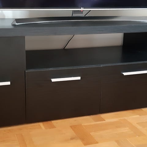TV-bänk i vit färg med en dörr på vänster sida och tre lådor på höger sida. Överst finns två öppna fack för till exempel mediautrustning. Handtag och ben i metallfärg. Passar som förvaringsmöbel i vardagsrum eller sovrum.