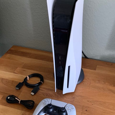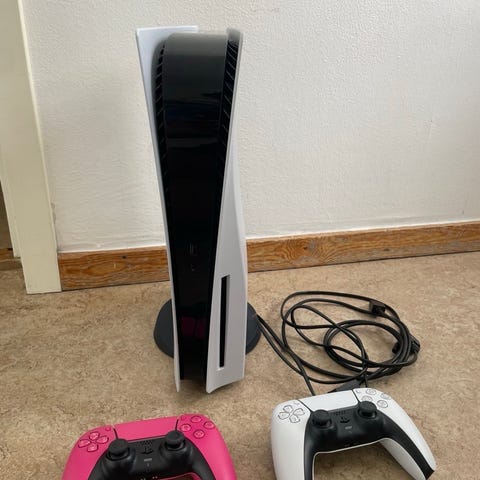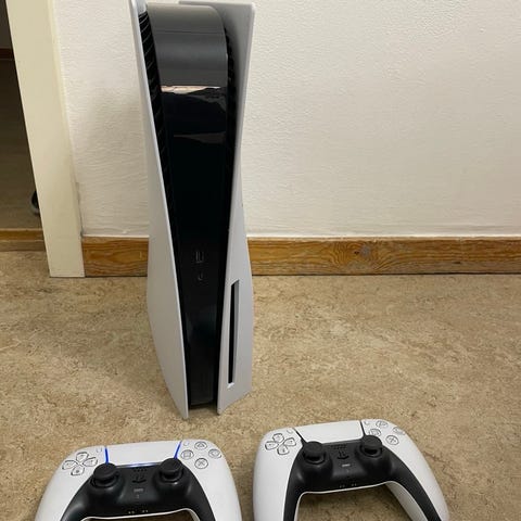 Sony Playstation 5 spelkonsol i vit färg med två DualSense-handkontroller. Konsolen är avsedd för hemmabruk och ansluts till TV eller bildskärm via HDMI. Den har flera USB-portar för anslutning av tillbehör och lagringsenheter. DualSense-handkontrollerna är trådlösa och kan laddas via USB-kabel. Produkten lämpar sig för spel, streaming och multimediaanvändning i vardagsrum eller spelhörna.