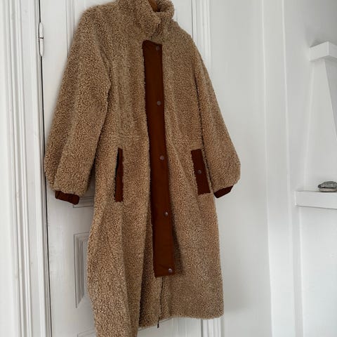 Gina Tricot kappa för dam i storlek XXS. Modellen är i beige fuskpäls med knytskärp i midjan och huva. Kappan har en mjuk, strukturerad yta och är lämplig som ytterplagg under svalare väder.
