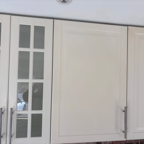 Köksskåp i vit färg med profilerade luckor och lådor. Skåpen är både vägg- och golvmodeller samt en köksö/enhet fristående på golv. Handtag i mörk metall. Bänkskiva i träutseende. Vitvaror som syns på bilderna ingår inte nödvändigtvis utan annonsen avser främst köksinredningen med skåp och fronter.