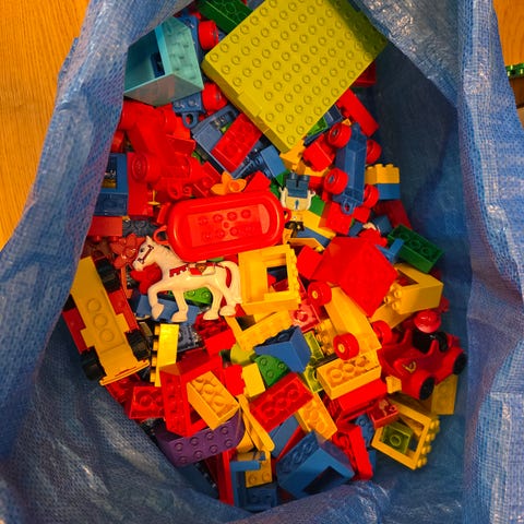 LEGO DUPLO klossar blandat parti. Innehåller olika typer av större DUPLO-klossar och delar i flera färger. Passar för bygglek och konstruktion för yngre barn som använder DUPLO-systemet. Exakt antal delar och specifika set är inte angivna.