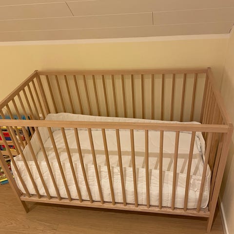 IKEA spjälsäng i två utföranden, en i träfärg och en vit. Medföljer madrass och spjälskydd. Sängarna säljes nedmonterade.