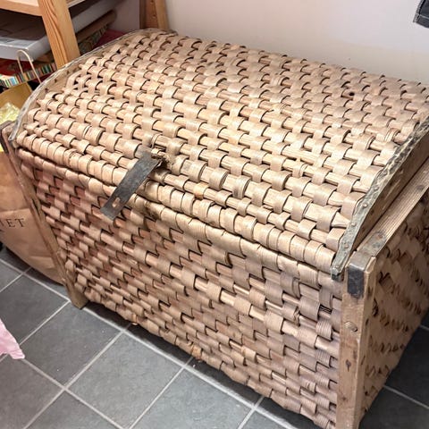 Flätade spånkontar, den minsta rymmer 20 liter, den största kan bäras på ryggen. Båda i gott skick