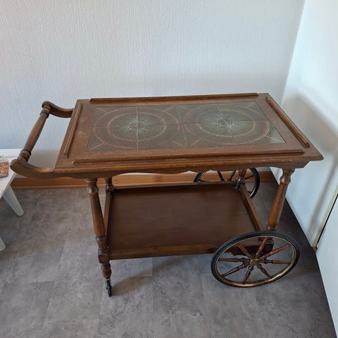 Säljer en fin serveringsvagn i ljusgrå färg med klassisk design. Perfekt som drinkvagn, sidobord eller dekorativ möbel i hemmet.