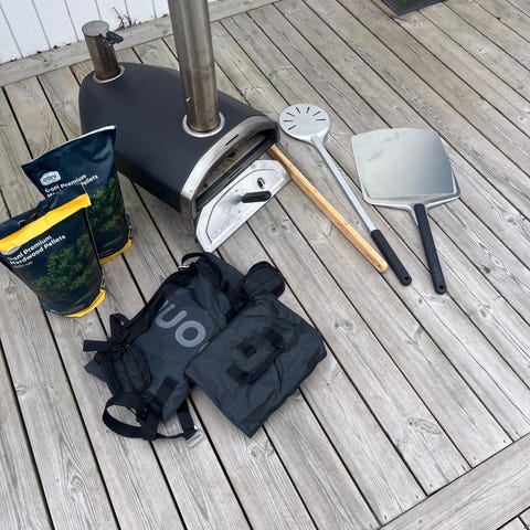 Ugnen är vedeldad i originalutförande men jag har dock köpt till insatsen för gasol så att man kan välja vilket man vill använda. En påse av Oonis träkol ingår också.