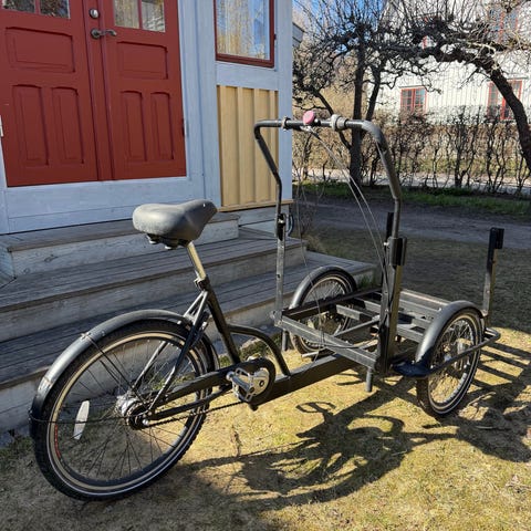 Lådcyckel med två soffor i låda. Perfekt att köra barnbarnen i.