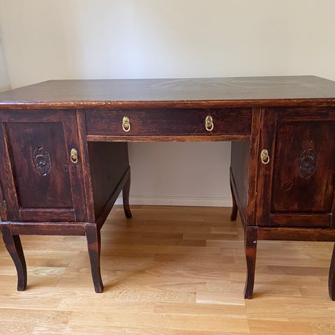 Vackert skrivbord i trä med klassisk design och flera lådor för förvaring. Perfekt som arbetsbord eller dekorativ möbel i hemmet.
