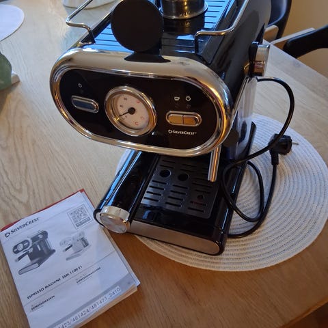 Ariete 1381 espressomaskin i rostfritt stål. Maskinen har manometer på fronten för tryckindikering, avtagbar droppbricka och vattentank på baksidan. Utrustad med portafilter och ångmunstycke för skumning och uppvärmning av mjölk. Passar för bryggning av espresso och andra kaffedrycker i hemmet. Levereras med bruksanvisning enligt modellbeteckning 1381.