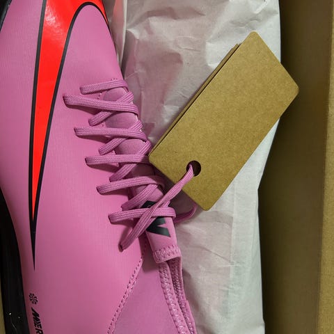 Fotbollsskor i flera olika modeller och färger. På bilden syns bland annat orangea, vita och svarta skor med snörning och dobbar anpassade för spel på plan. Skorna är avsedda för fotboll och lämpar sig för användning på gräs- eller konstgräsplan beroende på dobbutformning. Exakta storlekar och märken framgår inte av informationen utan får kontrolleras vid intresse.