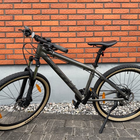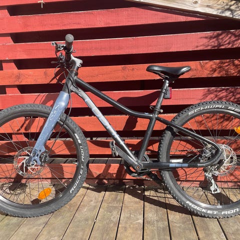 Fin cykel som använts lite i skogen, men främst till och från skolan. Liten buckla på bromshandtaget, se bild, men inget som påverkar användandet. I övrigt fint skick.