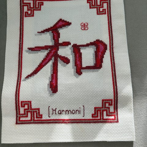 Vackert korsstygn broderi med det kinesiska tecknet för Harmoni.