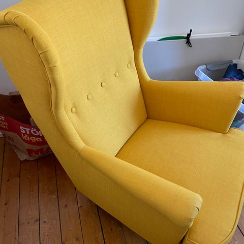 Fin äldre fåtölj säljes som renoveringsobjekt. Tyget behöver bytas, Köpt på Blocket med ambitionen att klä om den men kom aldrig så långt.