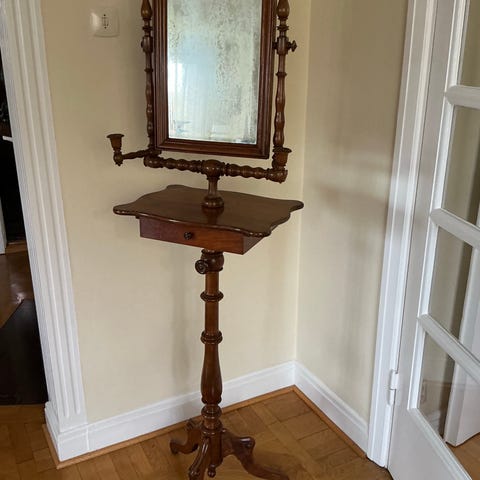Antik spegel med konsolbord i trä. Svarvade detaljer på både spegel och bord. Bordet har två ben och behöver stå mot en vägg. Vi har inte skruvat fast bordet i väggen och den har stått stabilt.