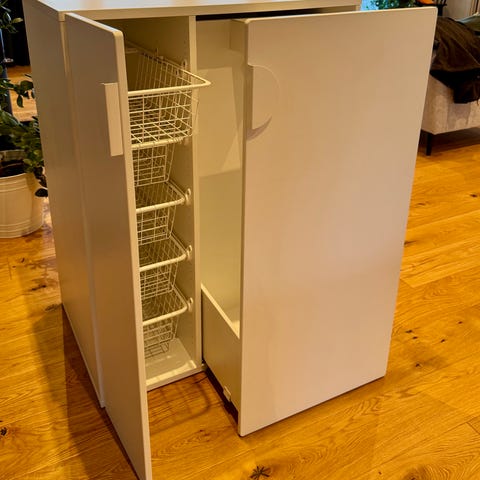 IKEA förvaringsskåp. Skåp med dörrar och två lådor, samtliga med utskurna handtag.