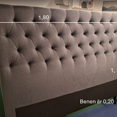 Mio sänggavel i grå textil med knappstoppad, rutquiltad framsida. Gaveln har raka ben nertill och en nedre del i mörkare kontrasttyg. Passar som huvudgavel bakom säng i sovrum. Materialet är ett vävt tyg i neutral grå nyans som är lätt att kombinera med olika inredningsstilar.