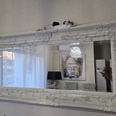 spegel i rektangulär modell. Spegeln har en vit, profilerad ram med dekorativa detaljer och är avsedd för väggmontering ovanför till exempel en byrå, skänk eller matplats. Passar i vardagsrum, matsal eller hall som väggspegel och inredningsdetalj.