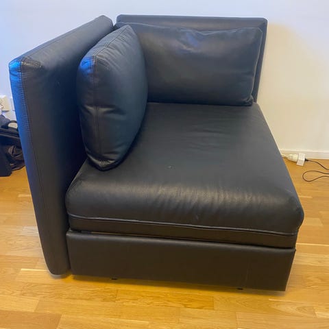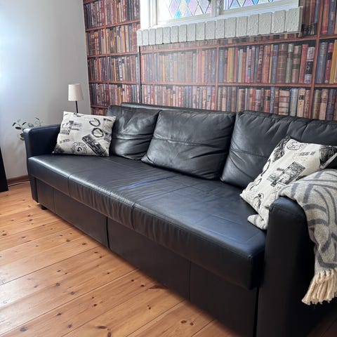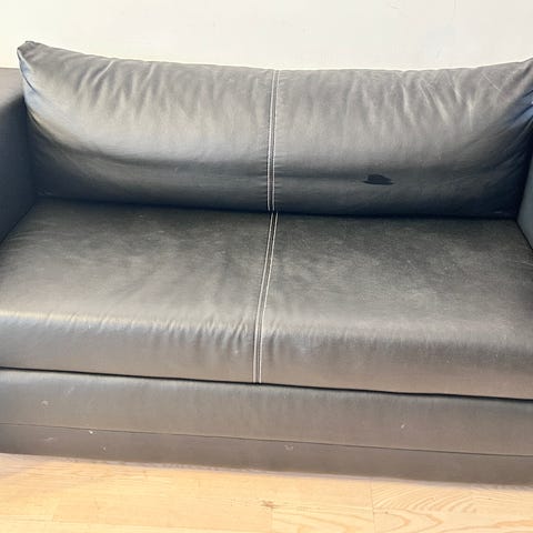 IKEA Askeby bäddsoffa i svart konstläder. Tvåsitsig soffa som kan fällas ut till säng. 110x 190 cm. Rak modell med breda armstöd och löstagbar ryggkudde i ett stycke. Passar som extra sovplats i till exempel vardagsrum, gästrum eller studentbostad. Materialet är enkelt att rengöra.