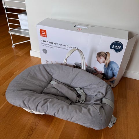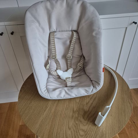 Stokke Tripp Trapp Newborn Set matstolstillbehör. Avsett som spädbarnsinsats till Stokke Tripp Trapp-stol för användning från nyfödd. Innehåller vadderad sits med sele och fästen för montering på stolen. Passar för matning och vila vid bordet tillsammans med familjen.
