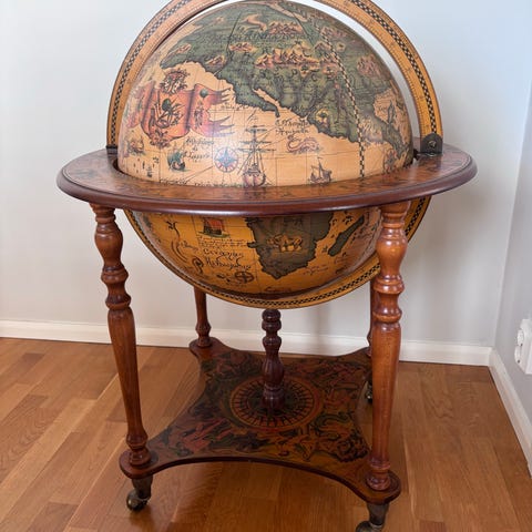Globus barskåp i brun träkonstruktion. Överdelen består av en klotformad glob som kan öppnas och rymmer flaskor och glas i ett indelat fack. Underdelen har en rund hylla för extra förvaring. Ytan är dekorerad med kartmotiv och illustrationer. Passar som förvaring av drycker och glas i vardagsrum eller matsal.