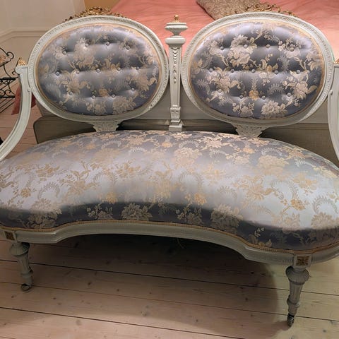 Behändig antik utdragbar soffa i brun träfinish med svängd huvudgavel och raka sidogavlar med enkla dekorativa snidna detaljer. Konstruktionen är i massivt trä med utdragbar del i två steg som gör att liggytan kan förlängas. Utrymmet under sitsen/locket kan användas för förvaring alternativt som en mindre extrasäng för t ex barn. Sitsen/lockets randiga sitt- och madrassdyna i beige och bruna toner ingår. För detaljerade mått, klicka på textrutan vid respektive foto.