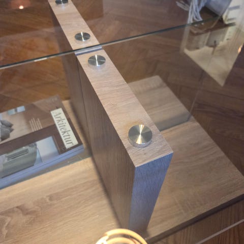 Tillverkat i trä med glasskiva och silverfärgade ben, vilket ger en modern och elegant stil.