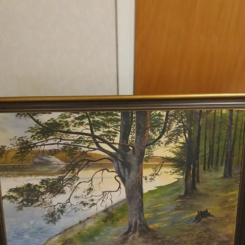 En fin oljemålning på pannå föreställande ett landskapsmotiv, med stuga och sjö. Tavlan är signerad, men konstnären är oidentifierad.