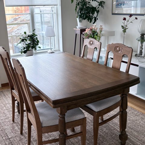 Matbord och 6 stolar i massiv ek. Stolarna klädda i grått tyg. Iläggsskiva ingår, 50 cm. Stabila stolar och bord.
