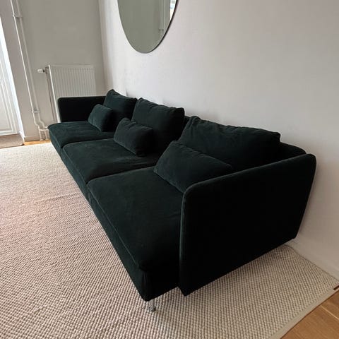 Tyget är Alva Moss (detta tyg finns inte längre hos Mio) Lite nopprig på ena armstödet, samt den är lite nedsutten på ena sidan (går säkert puffa till den ordentligt så det blir bättre)