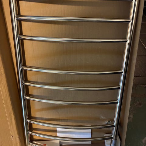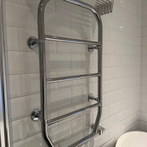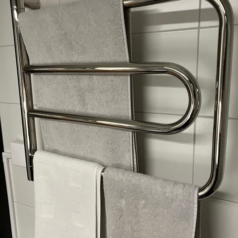 Väggmonterad handdukstork i kromad metall.