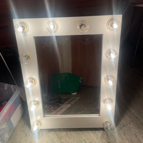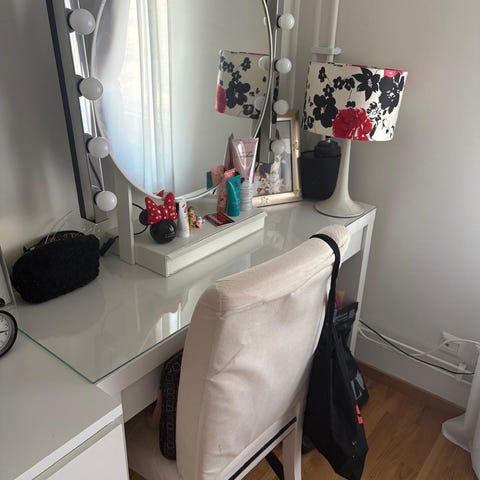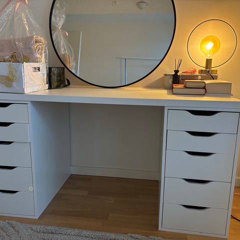 Rund spegel i vit ram med låda. Spegeln är fristående och placerad på ett bord, lämplig som sminkspegel eller spegel på skrivbord/byrå. Neutral design som passar i flera olika rum. Höjd 79cm diameter 64cm .