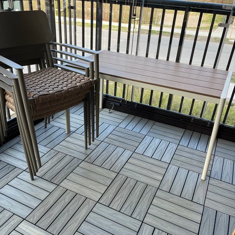 Grå plank i laminat med vita X ben i aluminium. Helt underhållsfritt och kan stå ute i alla väder.