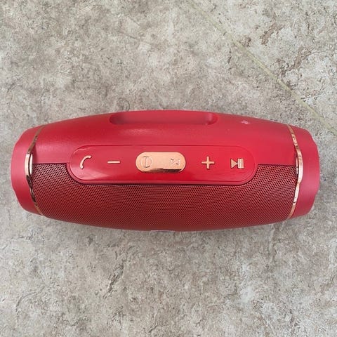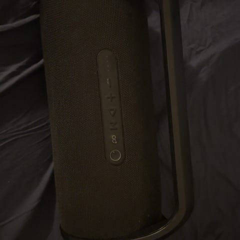 Luxor bärbar högtalare i svart utförande. Modellen har inbyggt bärhandtag och tygklädd front. På ovansidan finns touchknappar för av/på, volym, uppspelning och Bluetooth-koppling. På baksidan finns anslutningar för USB, micro-USB (DC 5V) och AUX-ingång, skyddade bakom en gummilucka. Högtalaren lämpar sig för trådlös musikuppspelning via Bluetooth samt kabelanslutning via AUX, och kan användas både hemma och på resor tack vare det integrerade handtaget.
