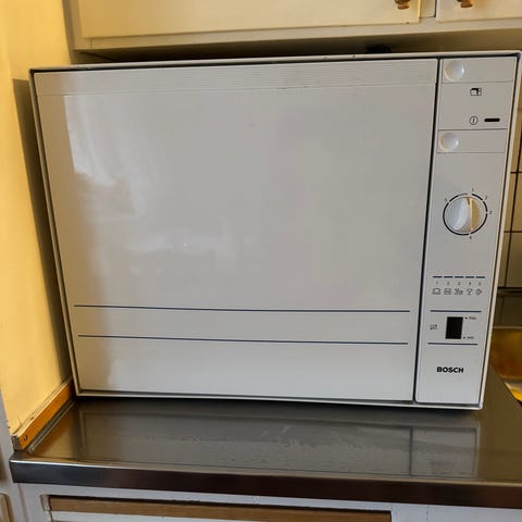 Bosch bänkdiskmaskin i vit färg. Diskmaskinen är fristående och avsedd att placeras på bänk. Passar för mindre kök eller där det inte finns plats för en fullstor diskmaskin.