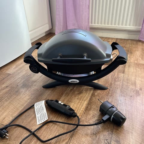 Använd ett fåtal gånger och förvarad i förråd. Kompakt bordsmodell med lock och grillgaller i gjutjärn. Elanslutning med medföljande kabel och reglage. Grillen levereras med överdrag. Lämplig för användning på balkong, terrass eller i mindre utrymmen där gas- eller kolgrill inte är möjlig.