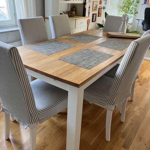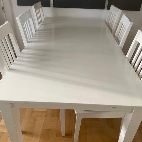 Modell ingrid från mio nypris: 8000kr.6 st stolar med nya dynorna, bord med iläggskiva. Bordsskivan behöver lackas om alt. lägga på en duk. Max bredd 225cm