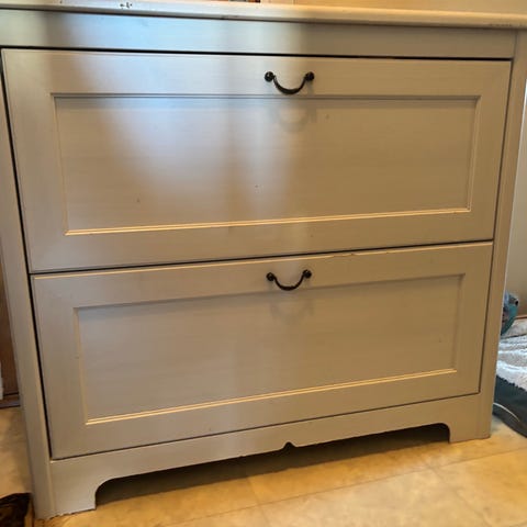 Röd byrå med tre lådor från IKEA. Synligt använd (se bilder). En knopp är böjd men går ju att byta ut bara. Och så lite repor hör och var. Funkar dock som den ska!