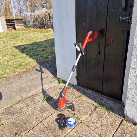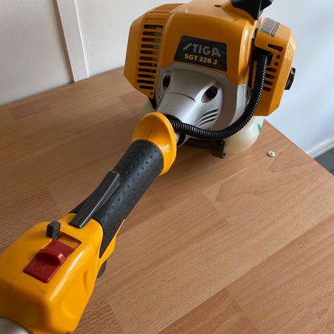 Grästrimmer med bensinmotor och röd motorenhet. Modellen har tvåhandsgrepp och axelrem/sele för bättre stöd vid användning. Lämplig för trimning av gräs och lättare sly i trädgård eller runt tomtgränser. Maskinen har rak rigg och trimmerhuvud längst fram.