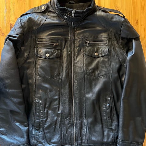 Herrjacka i svart skinn färg, storlek L. Jackan har hög krage, hel dragkedja framtill och flera fickor med dragkedja. Passar som ytterjacka för vardagsbruk.
