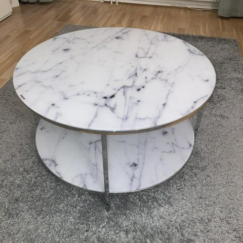 Mio soffbord runt vit marmormönstrad skiva med hylla
