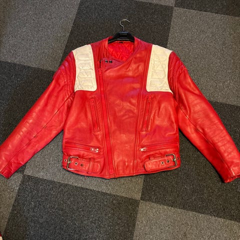 Corell skinnställ för motorcykel i tvådelad modell med jacka och byxa som kopplas ihop med dragkedja. Stället är i svart och rött skinn med förstärkningar och vadderade partier vid bland annat axlar, armbågar, höfter och knän. Avsett för motorcykelåkning och ger skydd och slitstyrka vid körning på väg eller bana.